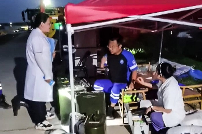 7月17日晚,已連續(xù)工作12小時的李健身心俱疲,工裝早已被汗水徹底浸透,輕輕一擰,就能擰出一把汗水來。因高溫體力不支,他突然感到頭痛、惡心,醫(yī)護(hù)人員迅速趕到現(xiàn)場進(jìn)行救治,初步診斷為中暑。醫(yī)生讓他去打點(diǎn)滴,輸液治療。李健考慮到晚上調(diào)配人手換班不方便,為了不影響晚上連續(xù)抽水,他僅僅吃了點(diǎn)藥,就又默默回到了自己的崗位上。這樣一干又是一個通宵。他常鼓勵隊(duì)員:“我們年輕人苦一點(diǎn)累一點(diǎn)沒啥,能盡快完成抽水任務(wù),讓災(zāi)區(qū)早日重建美麗家園是我們最大的心愿和動力?!?/span>