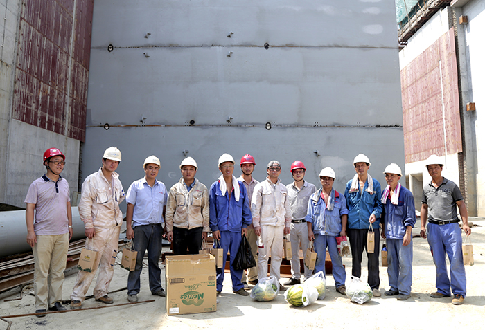 7月25日,水機公司黨委書記田建京、工會主席黃統(tǒng)及相關(guān)項目負(fù)責(zé)人前往芒稻閘、邵仙閘項目施工現(xiàn)場開展 “送清涼”活動,慰問戰(zhàn)斗在高溫酷暑下的一線員工。他們送去防暑降溫用品、西瓜和慰問金,囑托現(xiàn)場員工注意施工安全,合理調(diào)整作息時間,采取必要的防暑降溫措施,團結(jié)一心,攻堅克難,確保優(yōu)質(zhì)高效地完成項目施工任務(wù)。